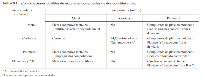 La fase de la matriz es cualquiera de los tres tipos básicos de materiales: polímeros, metales o cerámicos. La fase secundaria también es uno de los tres materiales básicos, o un elemento como el carbono o el boro. Como se aprecia en la tabla 9.1, las combinaciones posibles en un material compuesto por dos constituyentes puede organizarse en arreglo de 3 × 4. Se observa que ciertas combinaciones no son factibles, como la de un polímero en una matriz cerámica. También se ve que las posibilidades incluyen dos estructuras de fase que consisten en componentes del mismo tipo de material, como fibras de Kevlar (polímero) en una matriz de plástico (polímero). En otros compuestos, el material incrustado es un elemento como el carbono o el boro.