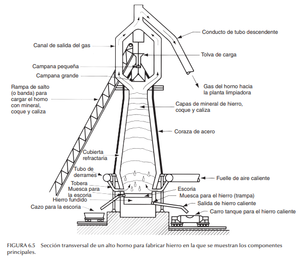 Fabricación de hierro Para producir hierro, se coloca una carga de mineral, coque y caliza en la parte superior de un alto horno. Un alto horno es una cámara refractaria recta con diámetro de 9 a 11 m (30 a 35 ft) en su parte más ancha, y altura de 40 m (125 ft), en el que se fuerzan gases calientes dentro de la parte baja de la cámara a tasas elevadas para llevar a cabo la combustión y reducción del hierro. En las figuras 6.5 y 6.6 se ilustra un alto horno común y algunos de sus detalles técnicos. La carga desciende con lentitud desde la parte superior del horno hacia su base y se calienta a temperaturas de alrededor de 1 650 ºC (3 000 ºF). La combustión del coque se lleva a cabo con gases calientes (CO, H2 , CO2 , H2 O, N2 , O2 y combustibles) que pasan hacia arriba a través de las capas de la carga de material. El gas CO tiene un efecto reductor en el mineral de hierro; la reacción (simplificada) se escribe como sigue (se usa hematita como el mineral de inicio):