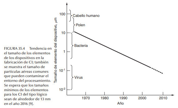 Gran parte de la secuencia de procesamiento de los circuitos integrados debe realizarse en una sala limpia, un ambiente que es más parecido a un quirófano que a una fábrica de producción. Los tamaños microscópicos característicos de un CI dictan la limpieza y esta escala continúa disminuyendo cada año que pasa. En la figura 35.4 se muestra la tendencia en los tamaños característicos de un dispositivo de CI; también se muestran en la misma figura las partículas comunes del aire que son contaminantes potenciales en el procesamiento de CI. Estas partículas pueden causar defectos en los circuitos integrados, lo que reduce el rendimiento e incrementa los costos.